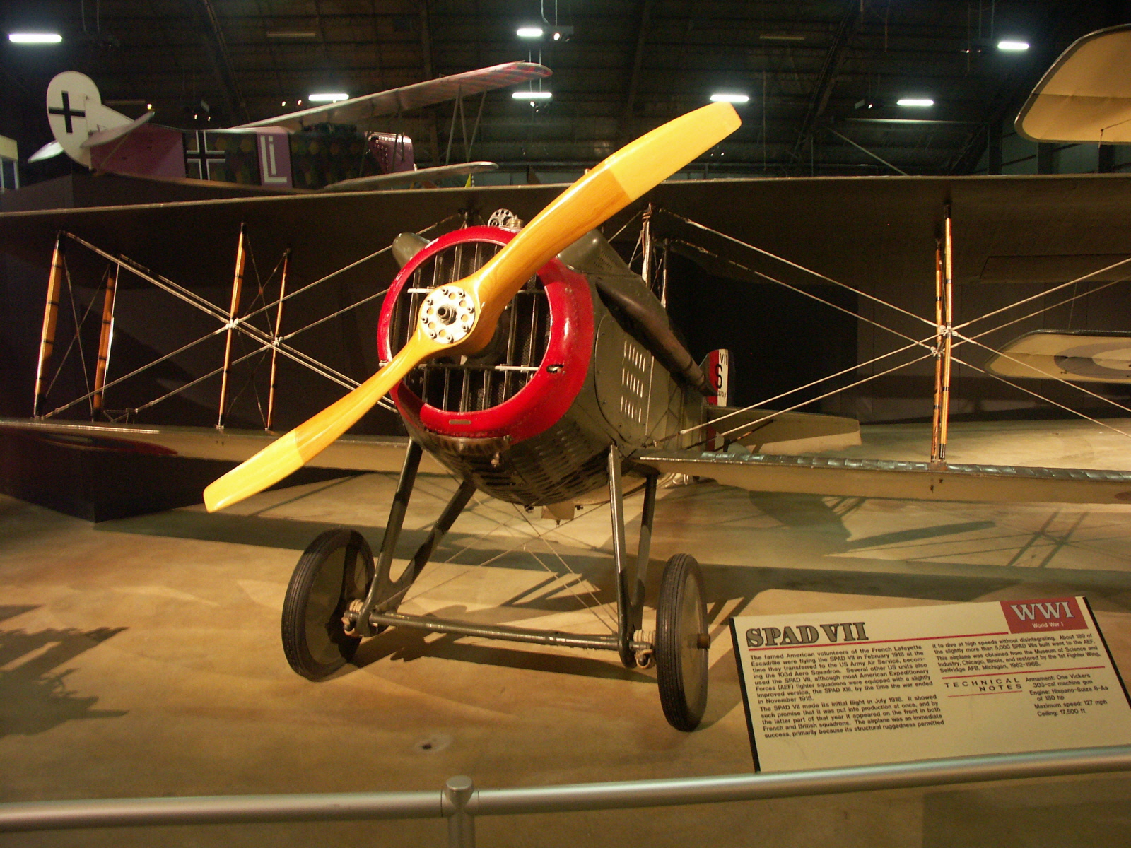 The SPAD VII made its initial flight in July 1916. It showed such promise that it was put into production at once, and by the latter part of that year it appeared on the Front in both French and British squadrons. The airplane was an immediate success, primarily because its structural ruggedness permitted it to dive at high speeds without disintegrating. About 189 of the slightly more than 5,000 SPAD VIIs built went to the AEF.