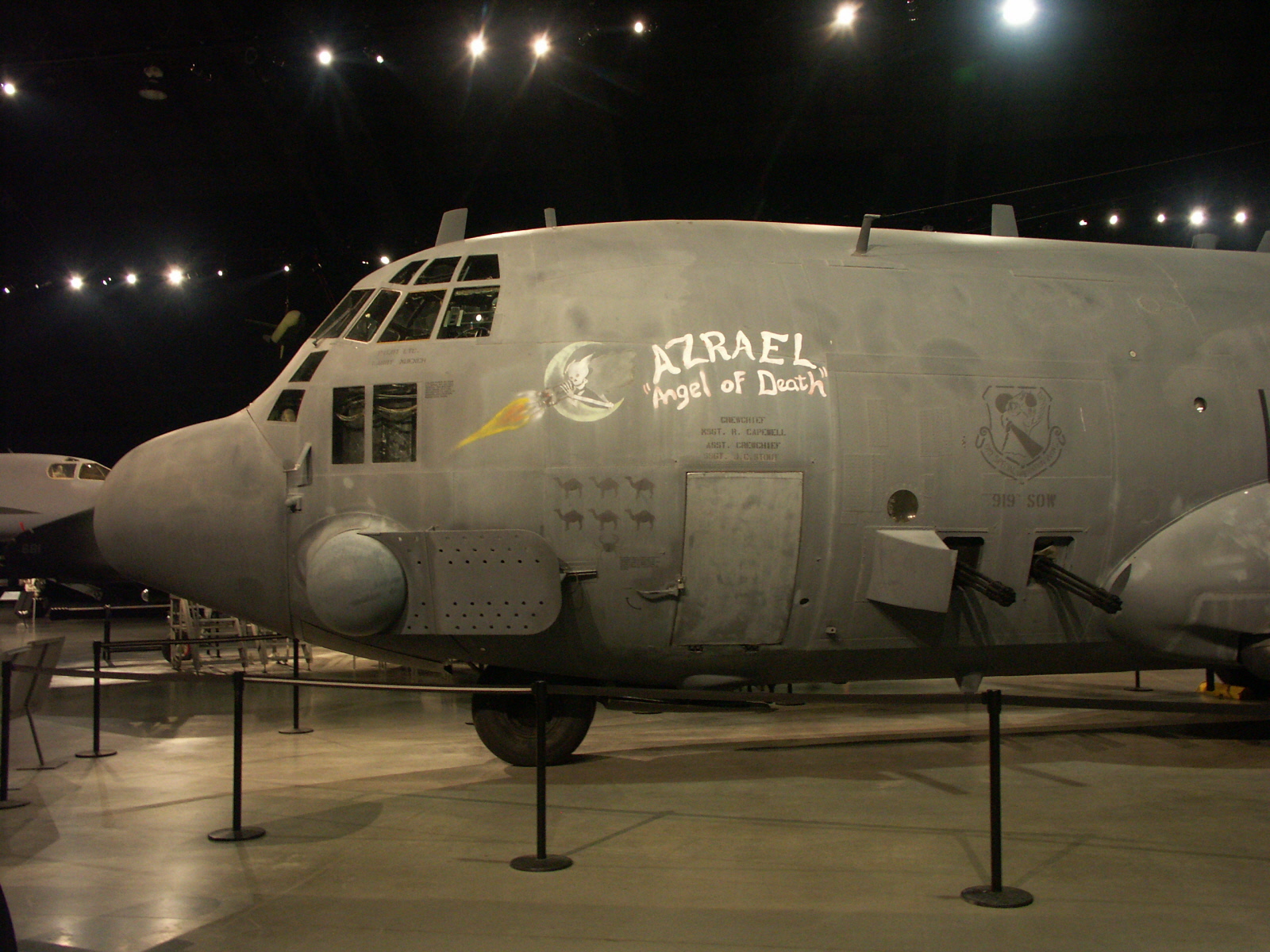 The crew of this AC-130A Spectre gunship, named Azrael (Azrael, in the Koran, is the angel of death who severs the soul from the body) displayed courage and heroism during the closing hours of Operation Desert Storm. On Feb. 26, 1991, Coalition ground forces were driving the Iraqi army out of Kuwait. Azrael was sent to the Al Jahra highway between Kuwait City and Basrah, Iraq, to intercept the convoys of tanks, trucks, buses and cars fleeing the battle. Facing numerous enemy batteries of SA-6 and SA-8 surface-to-air missiles, and 37mm and 57mm radar-guided anti-aircraft artillery, the crew attacked the enemy skillfully, inflicting significant damage on the convoys. The crew's heroic efforts left much of the enemy's equipment destroyed or unserviceable, contributing to the defeat of the Iraqi forces. On Feb. 28, 1991, Iraq agreed to a cease-fire.