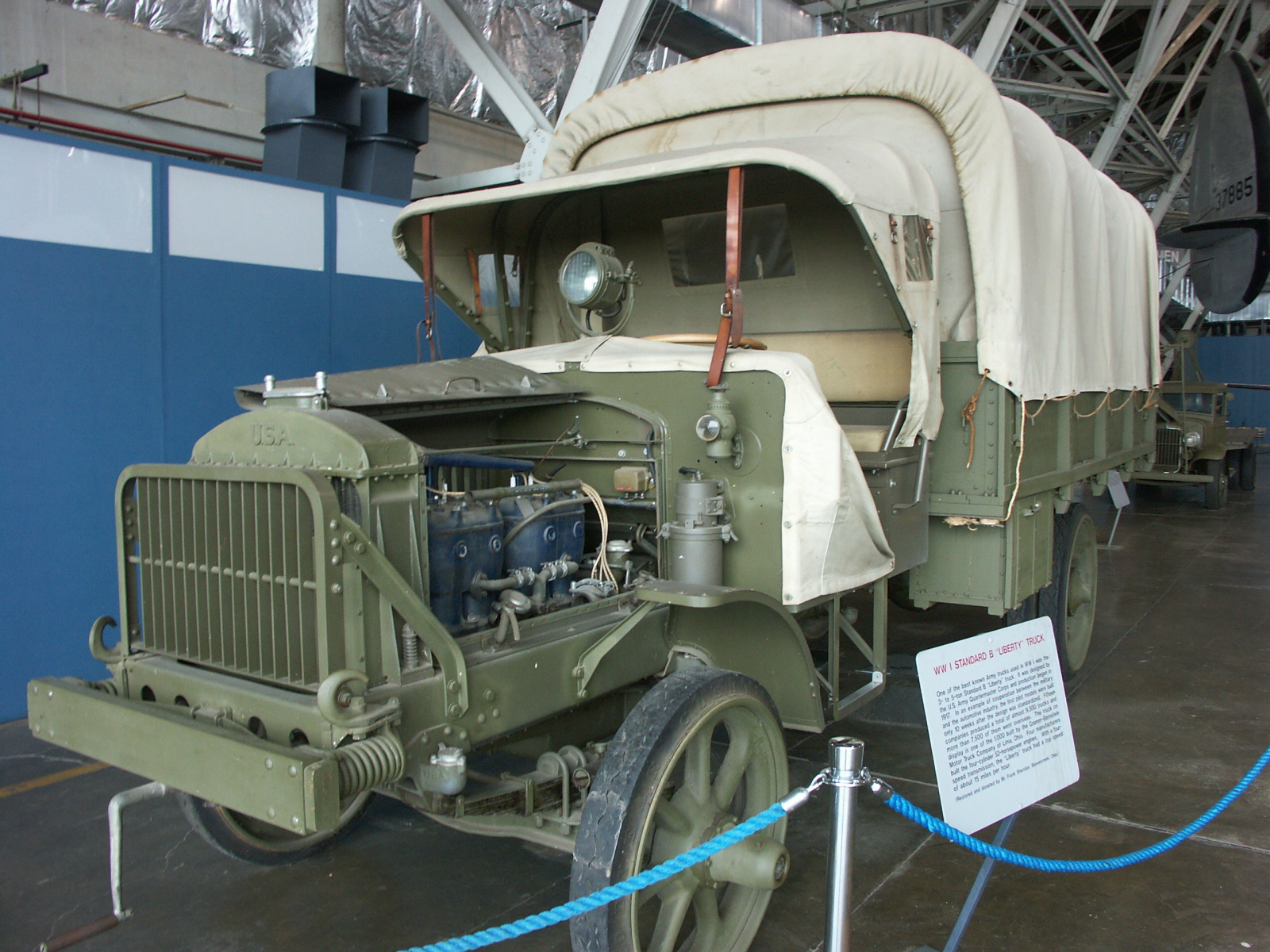 One of the best known Army trucks used in World War I was the 3- to 5-ton Standard B "Liberty" truck. It was designed by the U.S. Army Quartermaster Corps and production began in 1917. In an example of cooperation between the military and the automotive industry, the first pilot models were built only 10 weeks after the design was standardized. Fifteen companies produced a total of almost 9,500 trucks and more than 7,500 of them went overseas. The truck on display is one of the 1,000 built by the Gramm-Bernstein Motor Truck Co. of Lima, Ohio. Four manufacturers built the four-cylinder 52-hp engines. With a four-speed transmission, the "Liberty" truck had a top speed of about 15 mph.