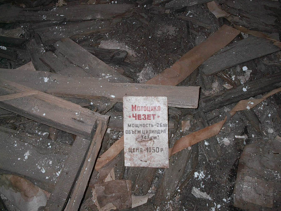 Label tells- motorcycle Chezet, 26hp, 343cc, price 1050 rubles... Chezet! that was a dream bike for all young people in a Soviet Union. Crowd of boys have been hunging around in those stores dreaming of what they could do with 26 hp bike if Grandpas had only 15 ponnies and how can you afford it, if average monthly wage was only 180 rubbles? then alarm, evacuation, panic... no shop assistants no police.. this shop has been emptied out in a matter of hour. Banks survived, even jewelry stores survived through evacuation day, but this shop didn't have a chance. P.S. Police start shooting marauders as only first radiactive tv sets appeared on a second hand market, in Kiev.