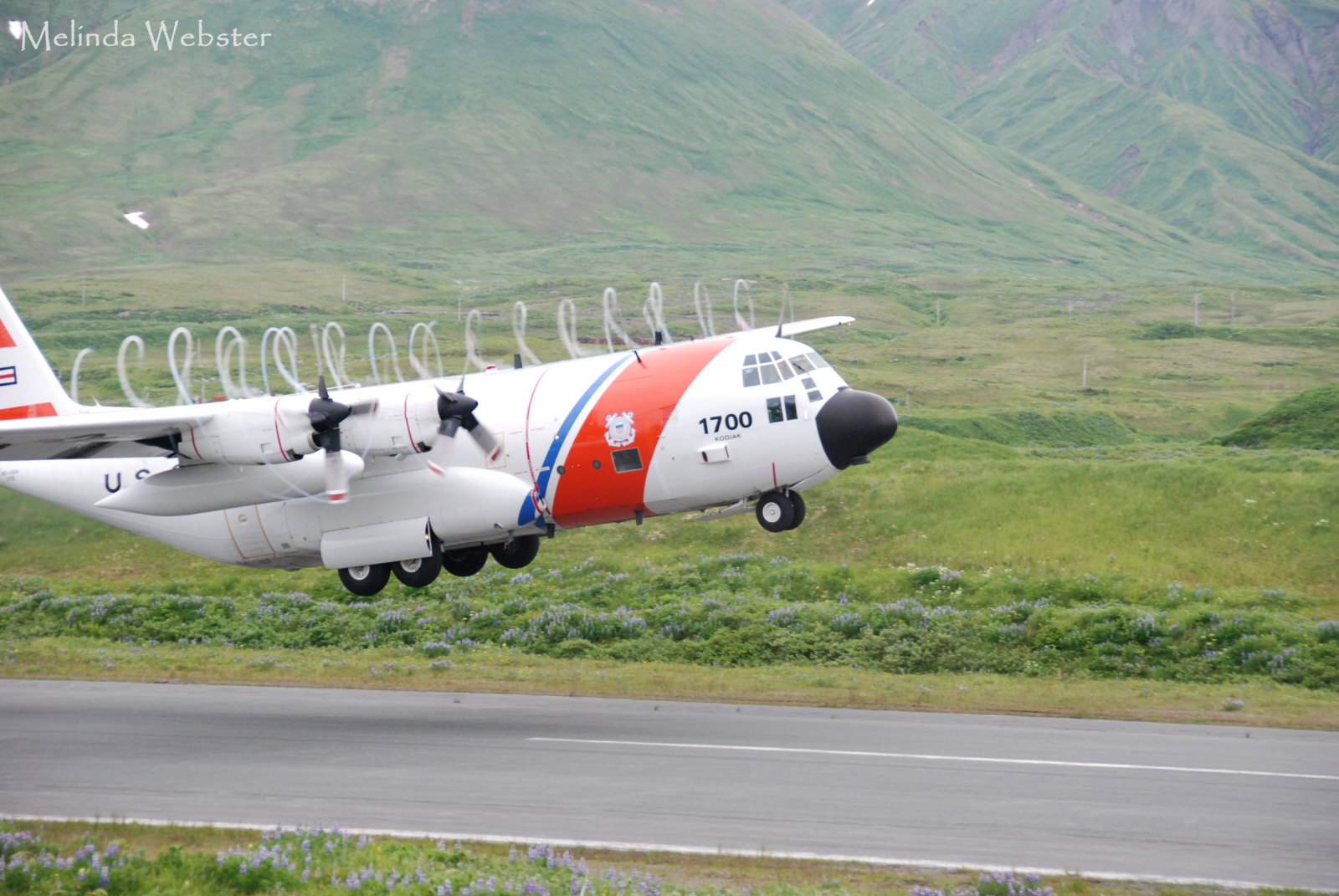 This C-130 took off from Attu while we were there. Check out the spiral vapor trails behind the props. Melinda took this picture.