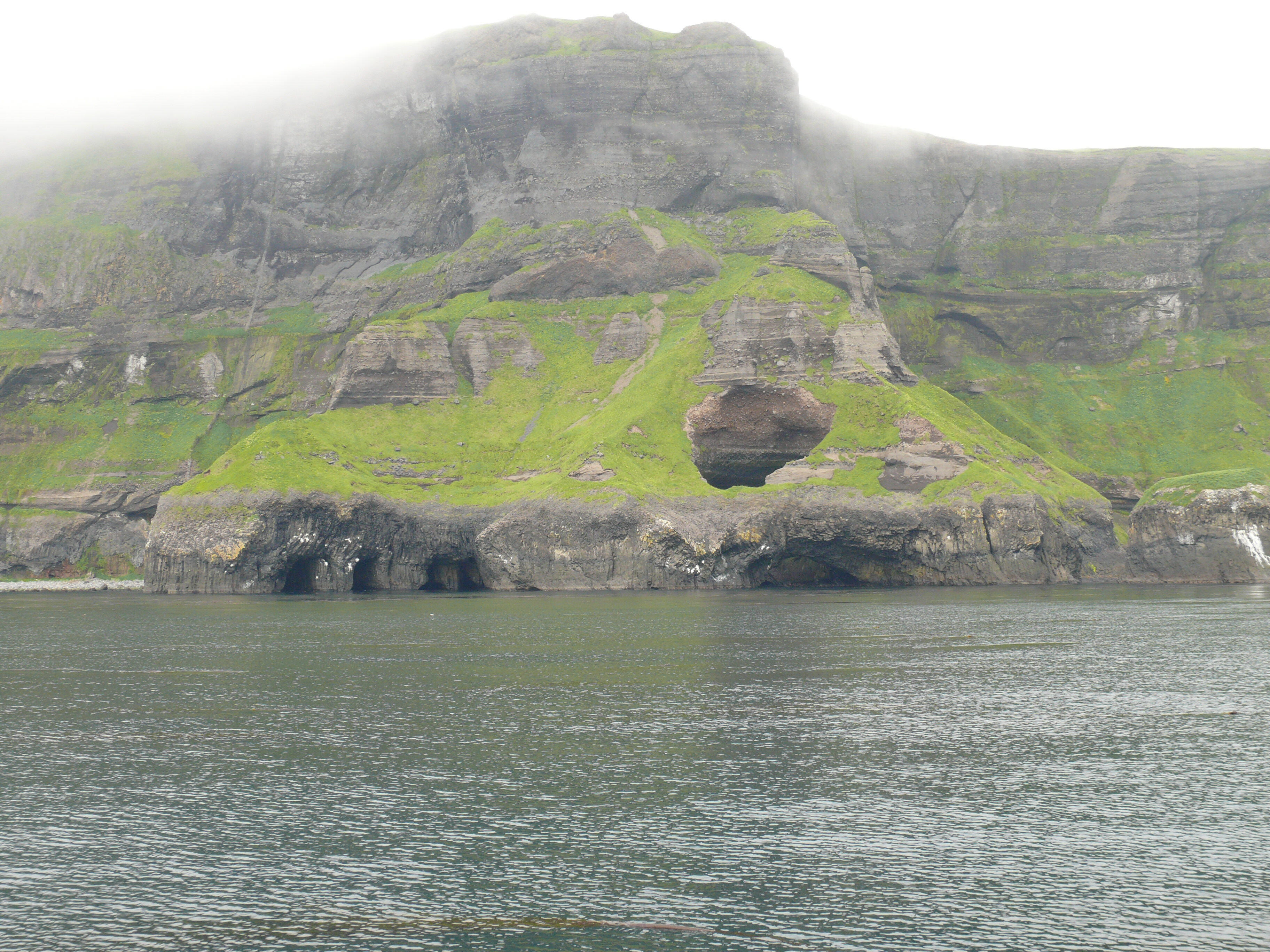 These caves at Battery Point, Akutan Island are big. We took the dinghy in the one on the right with the collapsed roof. One of them on the left has a tunnel opening to the rear that we went through.