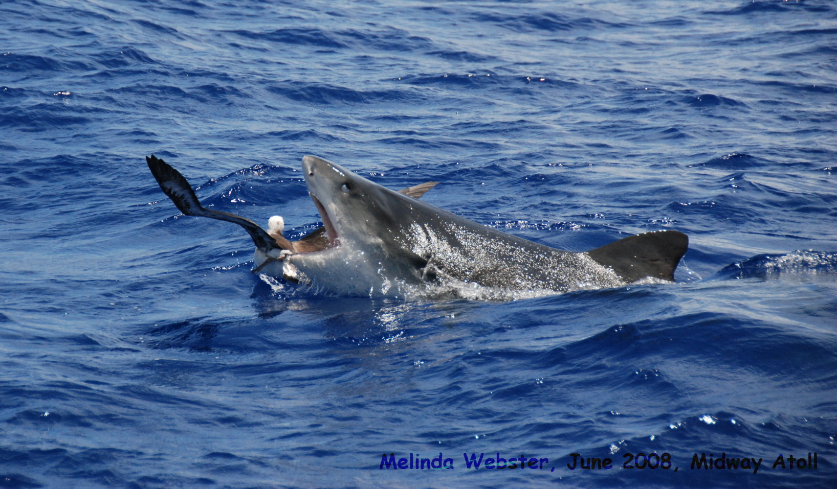 A tiger shark tries to grab a fledgling albatross off Midway Island. The albatross eventually escaped.