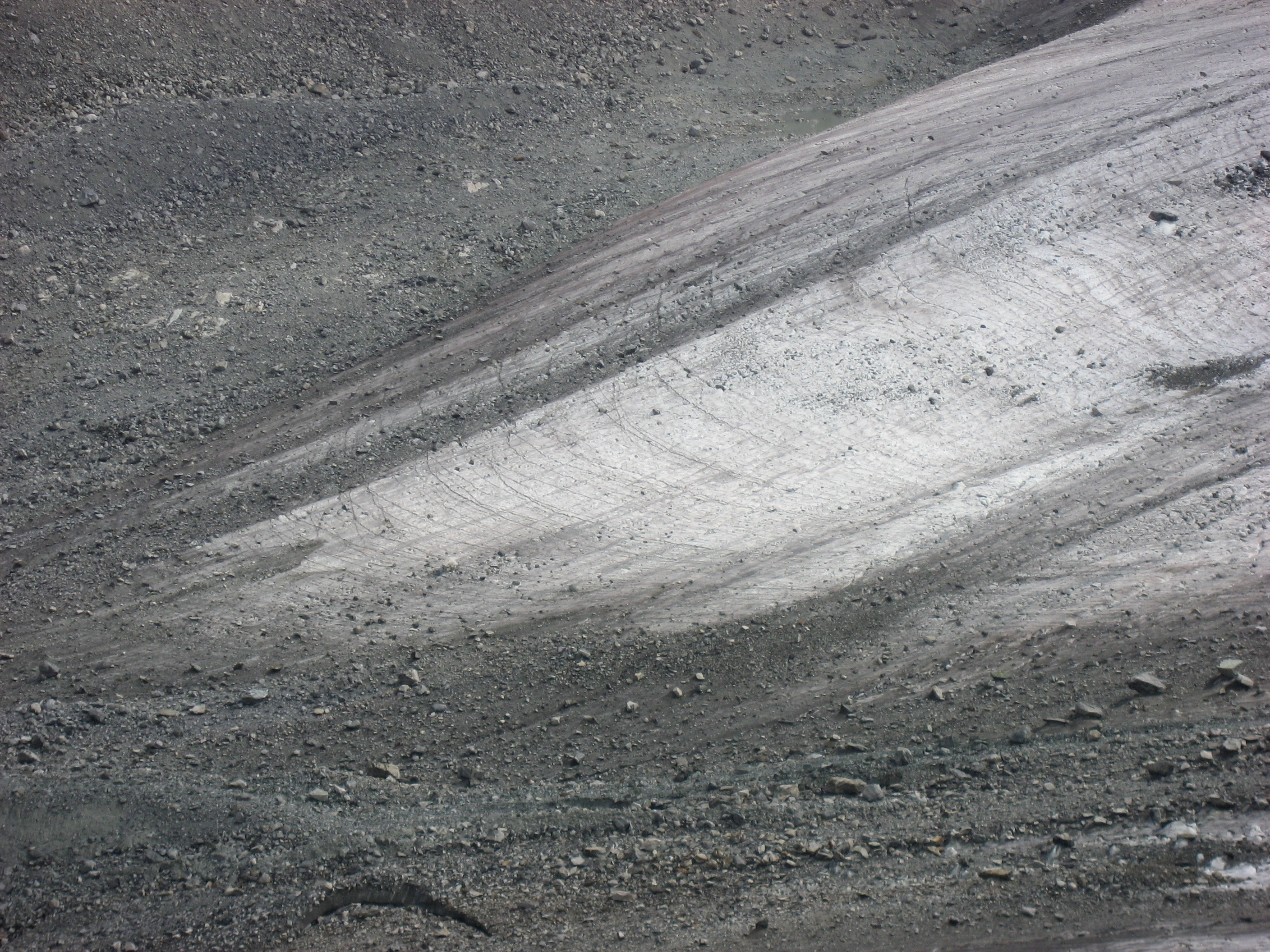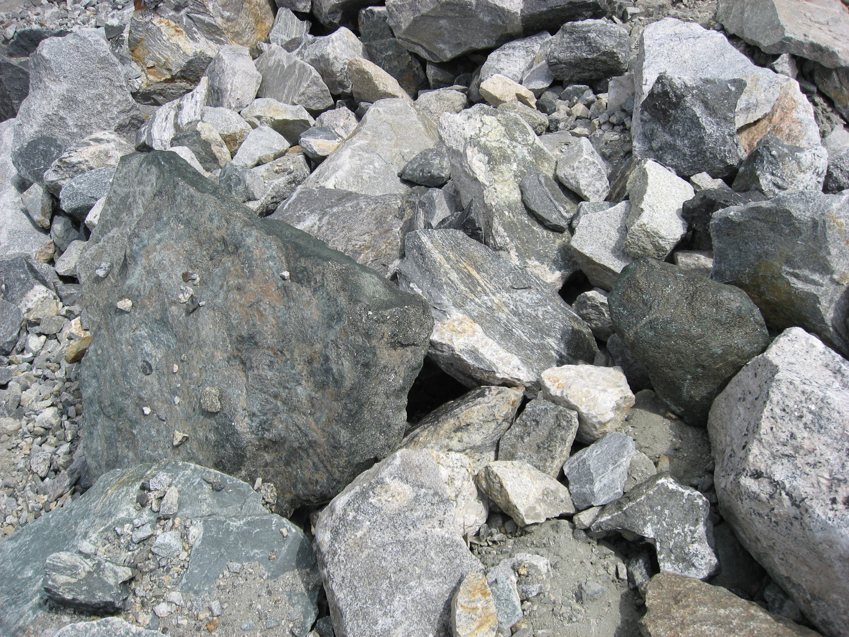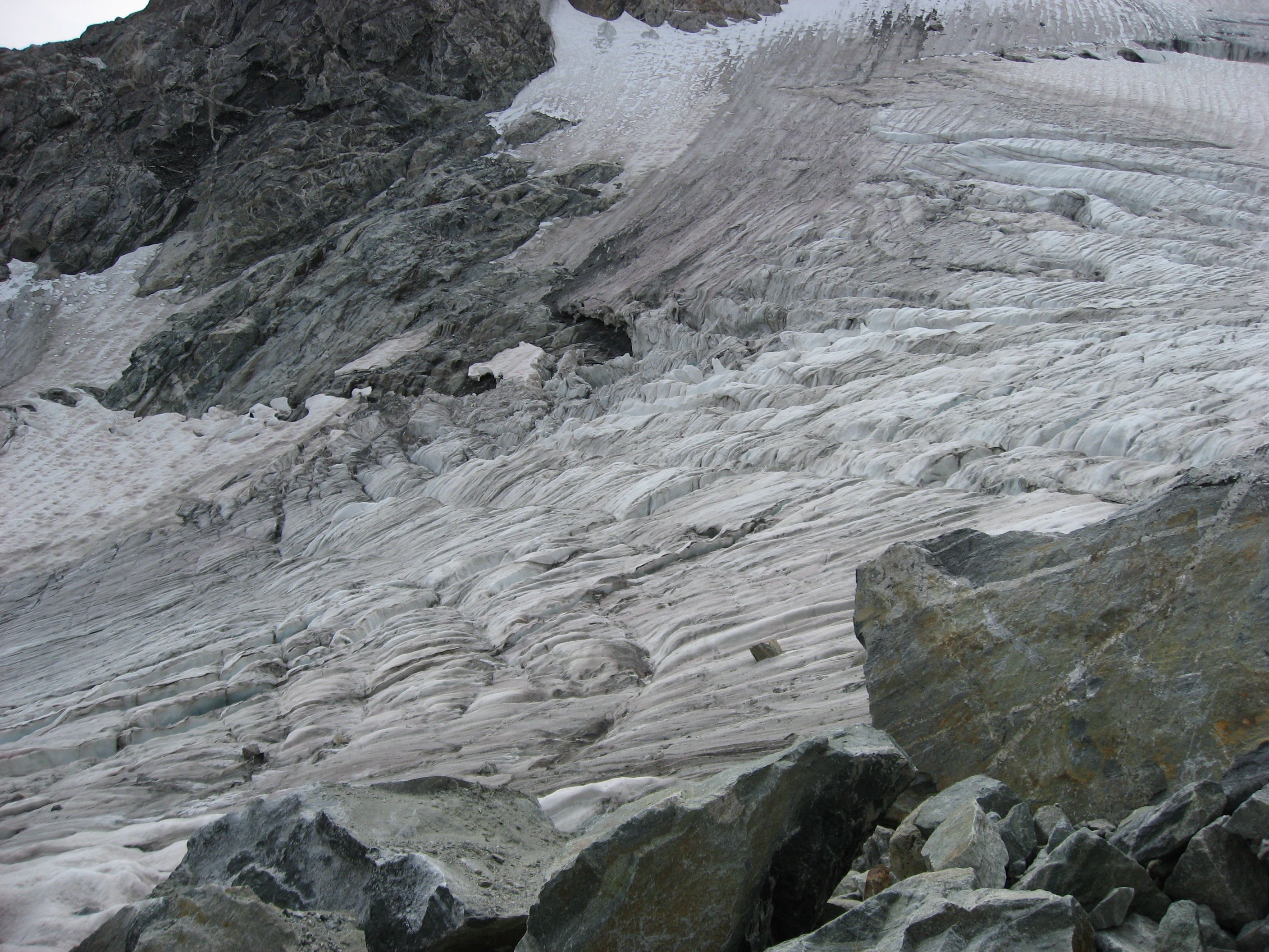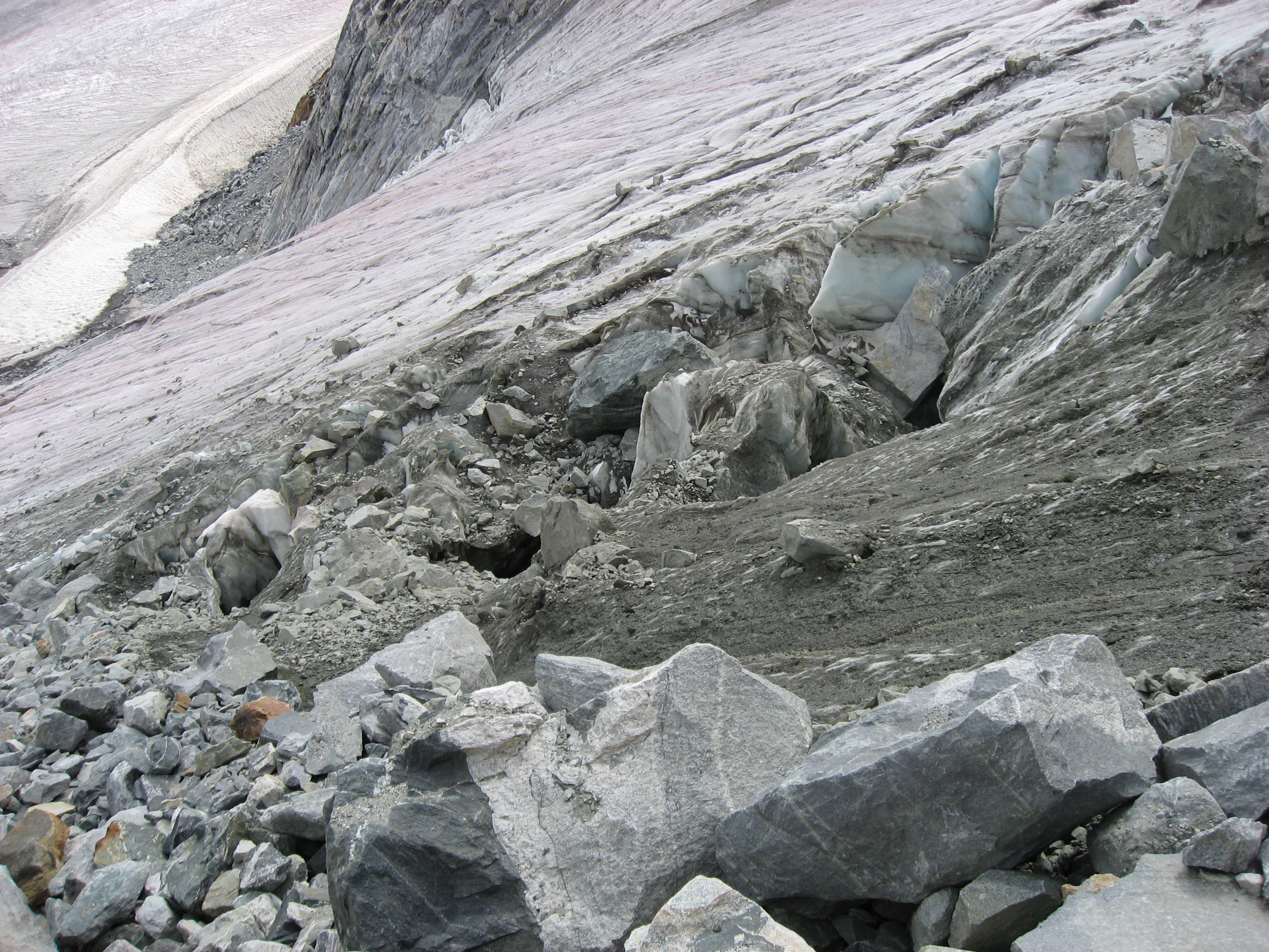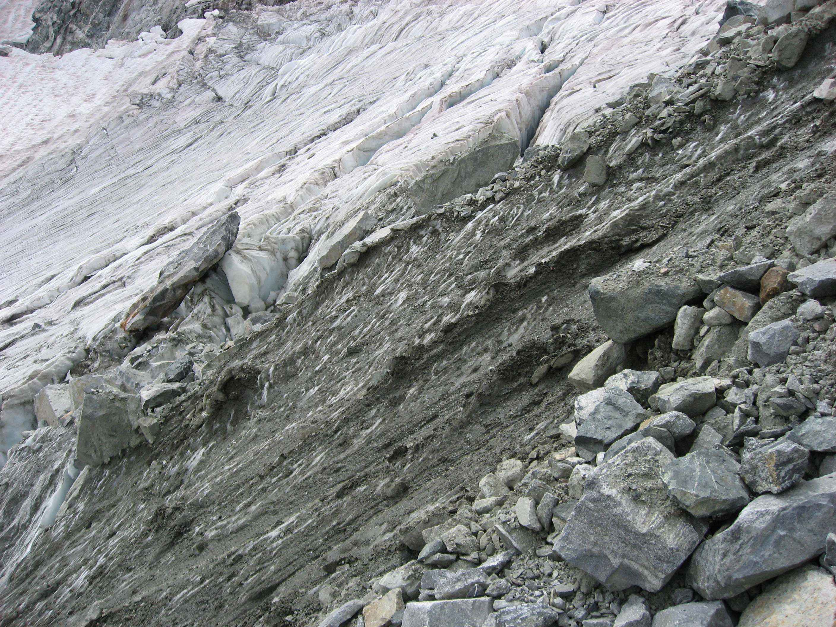 The boulders were on top of ice! In some places like this, they slide off. Every minute or so, a rock or two would come tumbling down the ice chute.