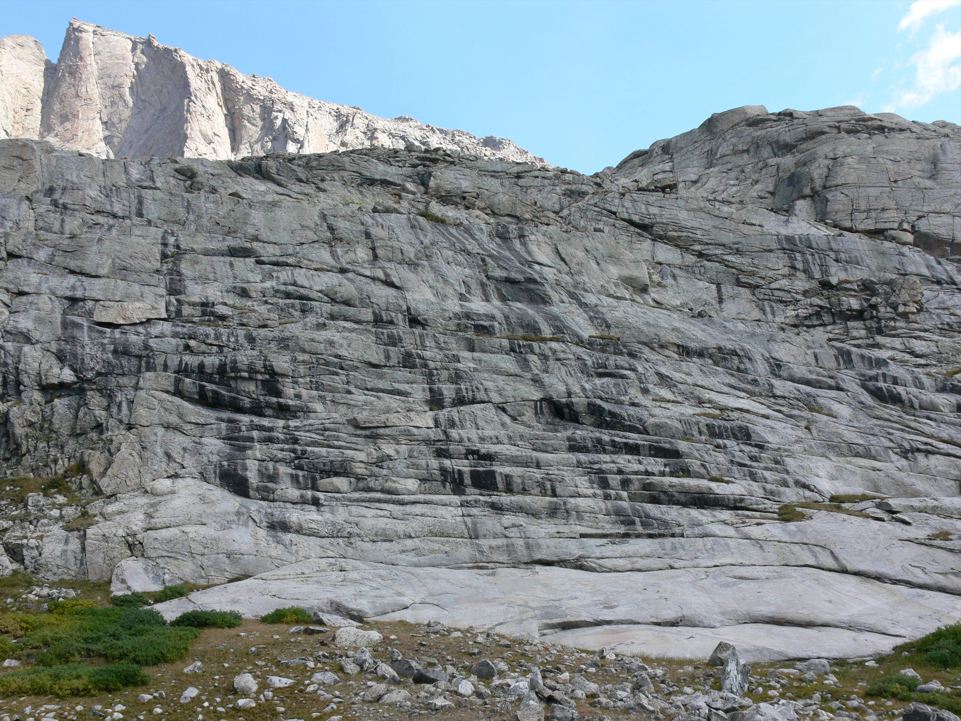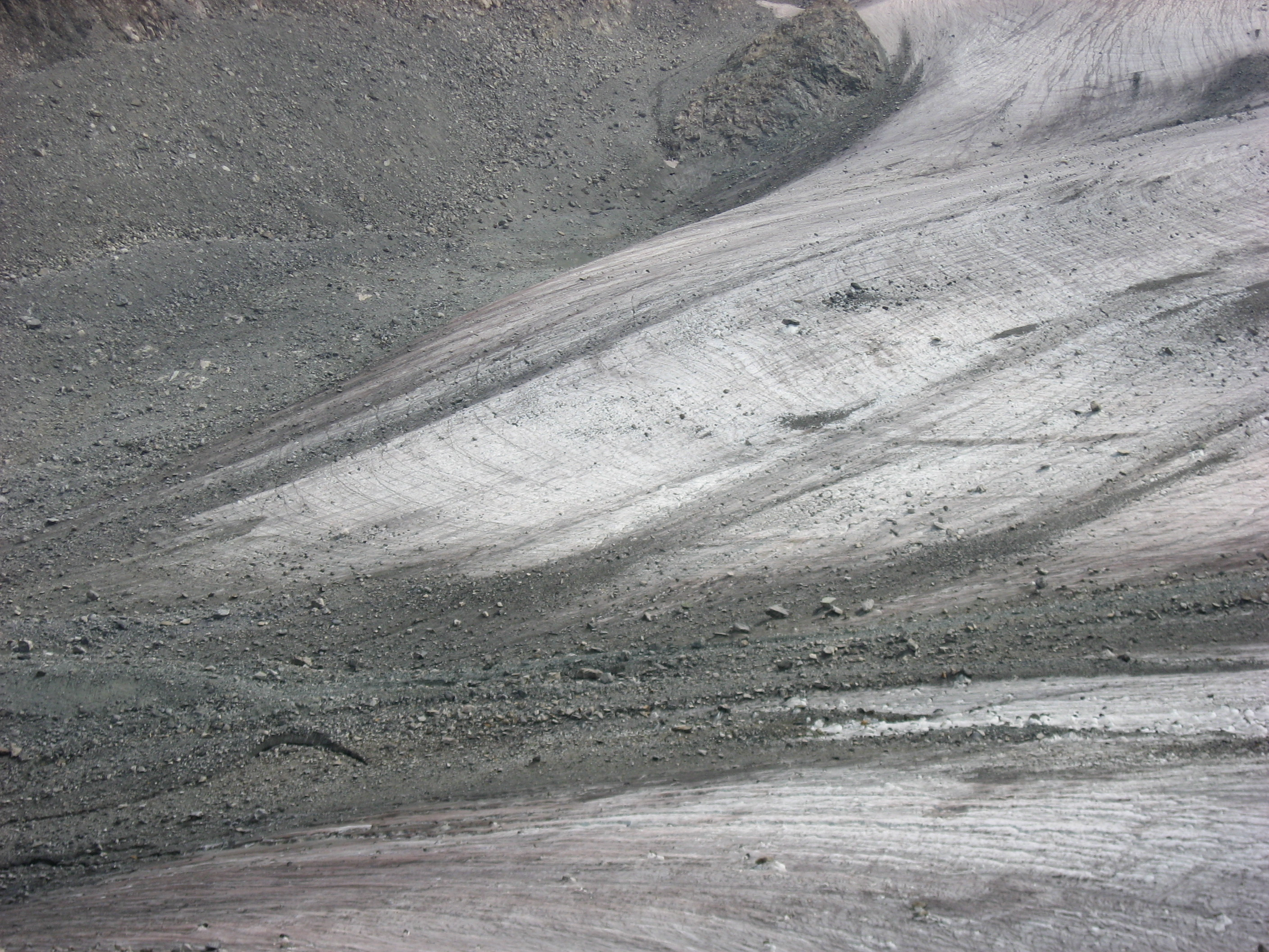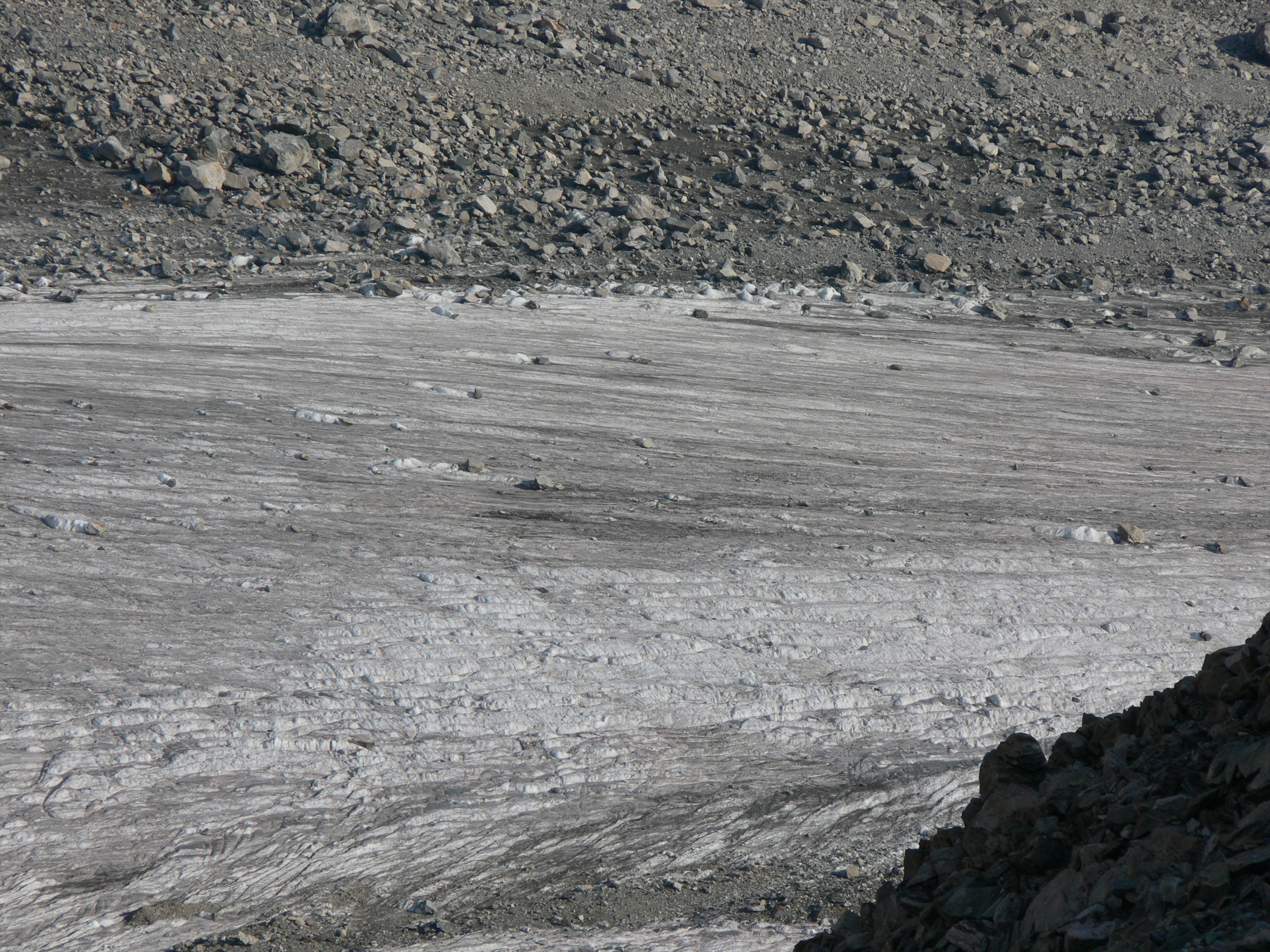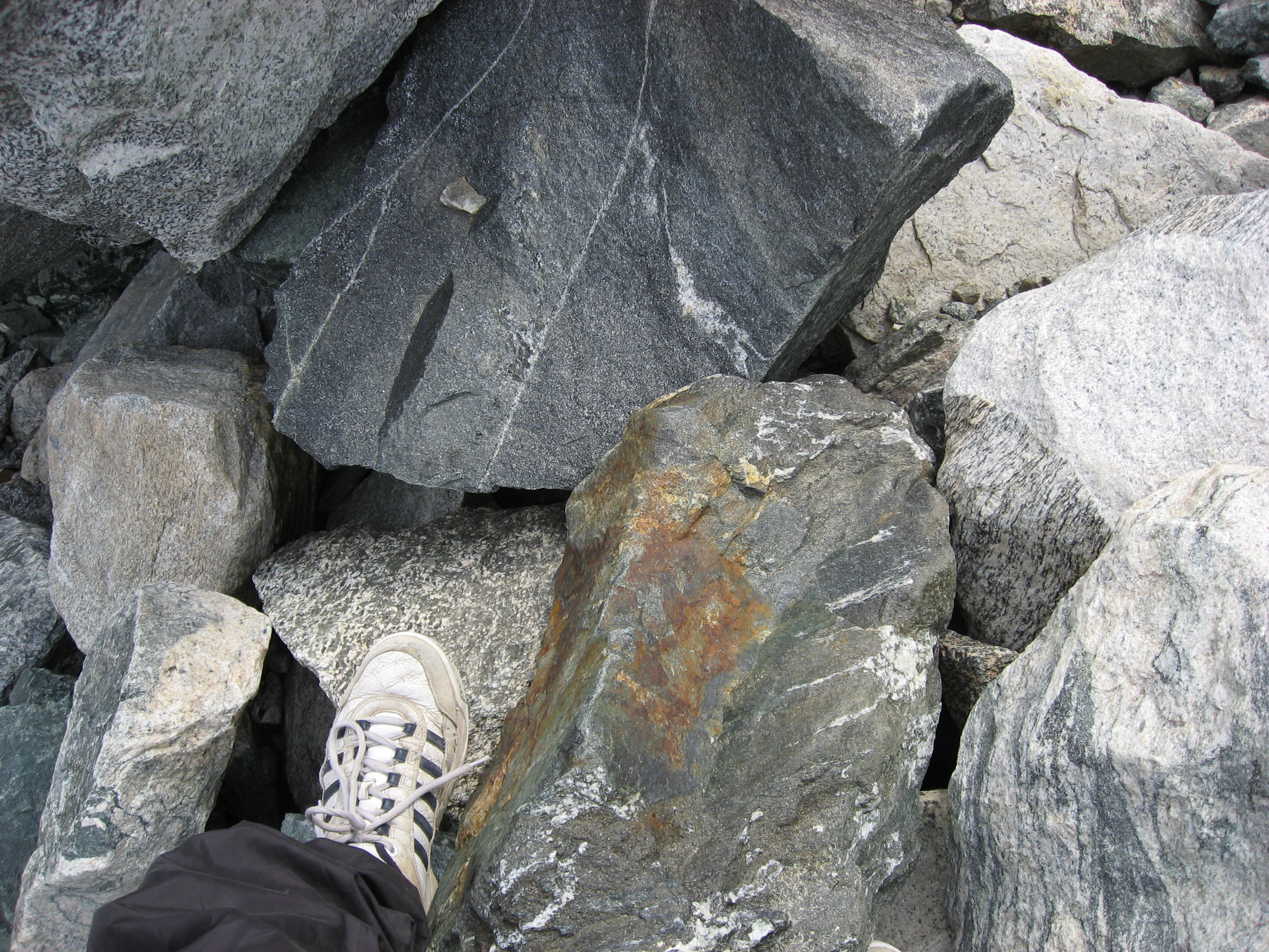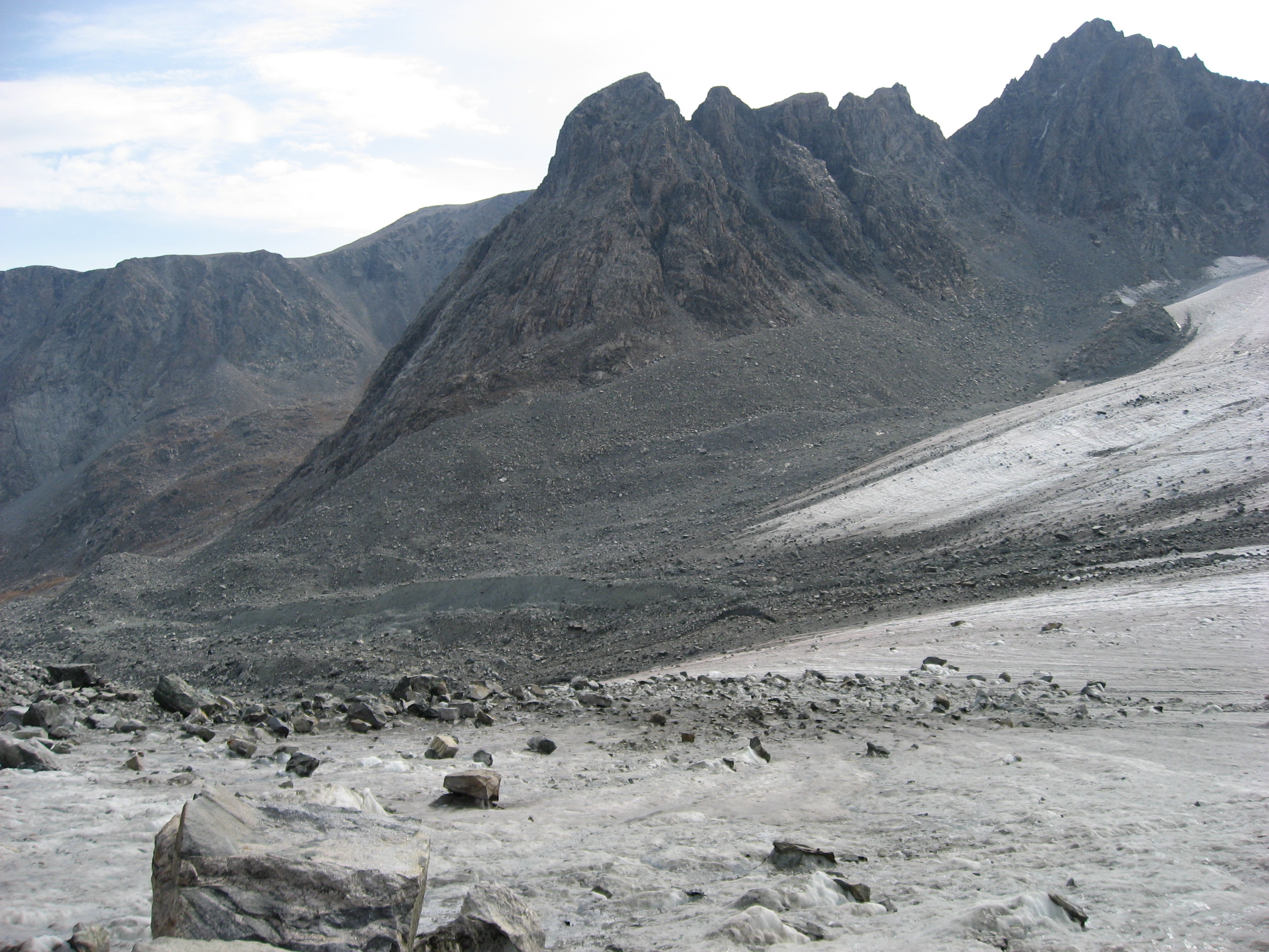 The boulders were on top of ice! In some places like this, they slide off. Every minute or so, a rock or two would come tumbling down the ice chute.