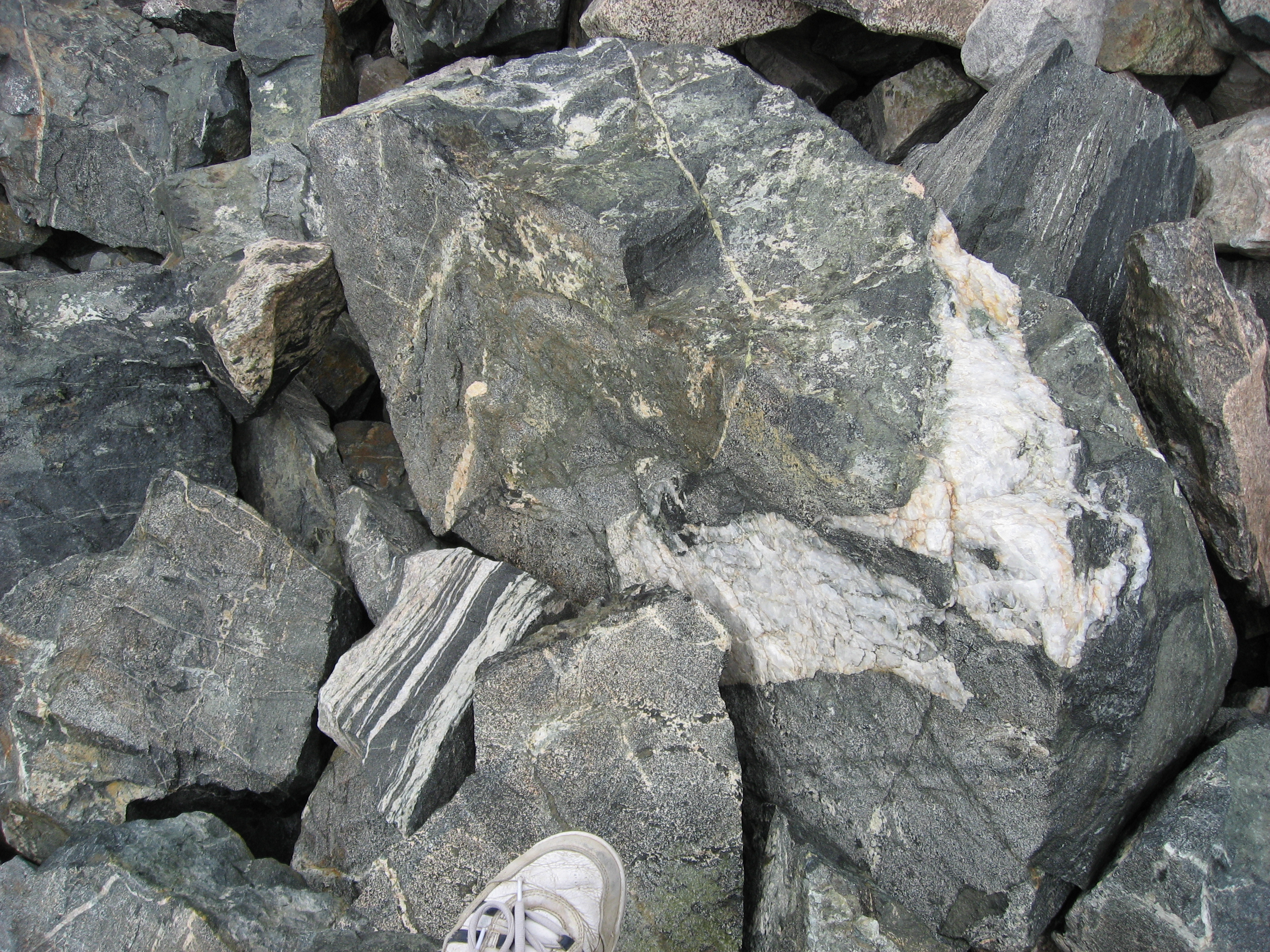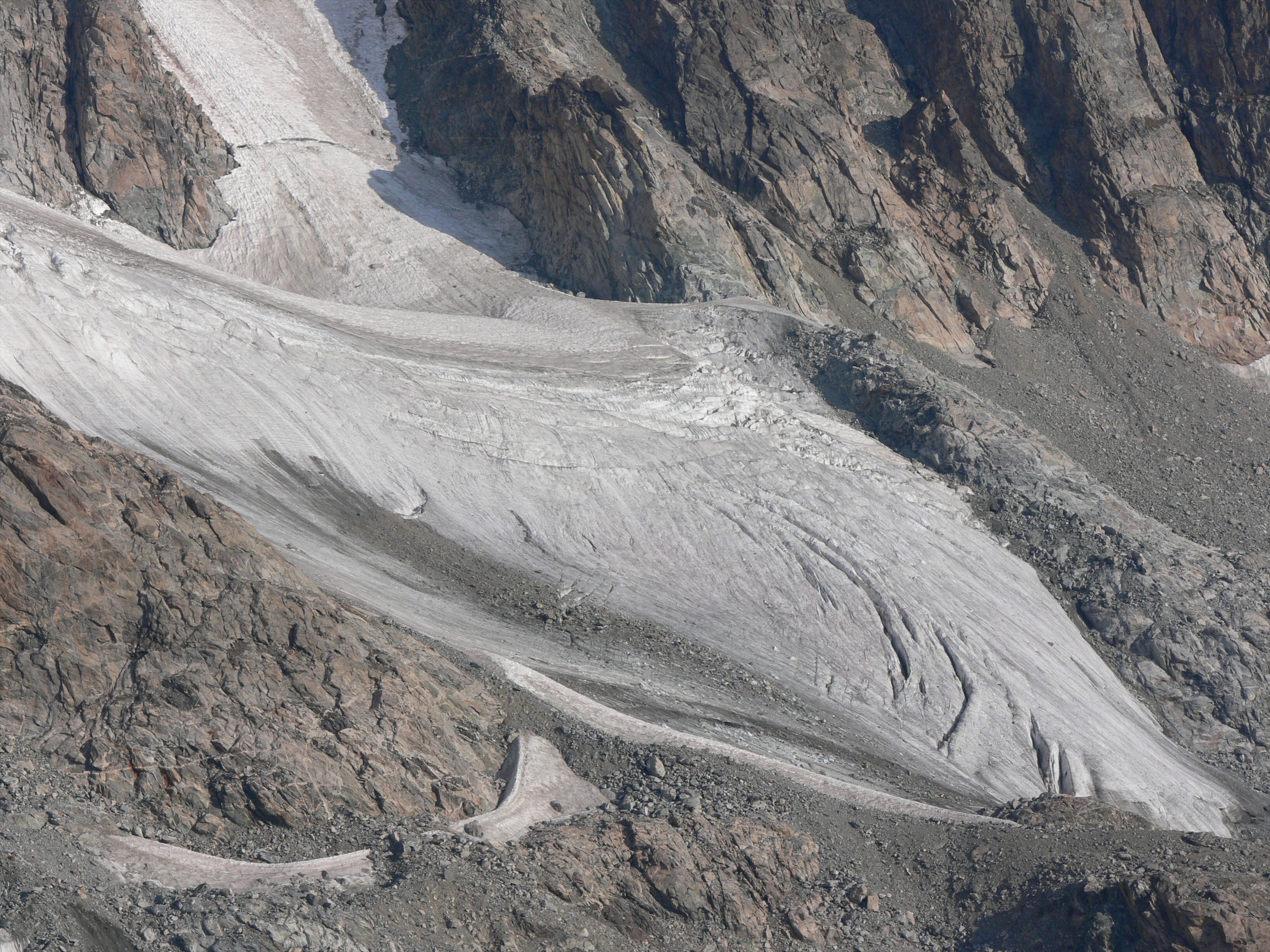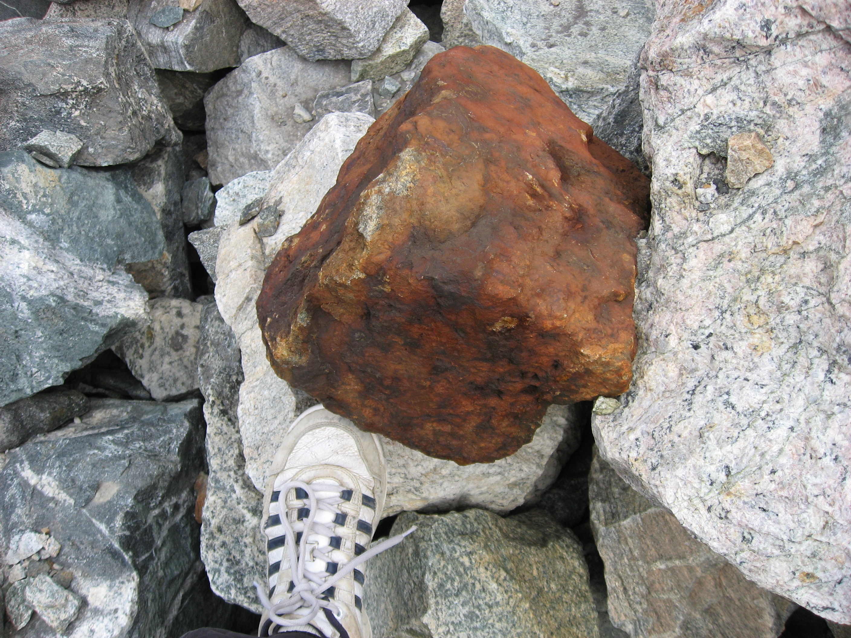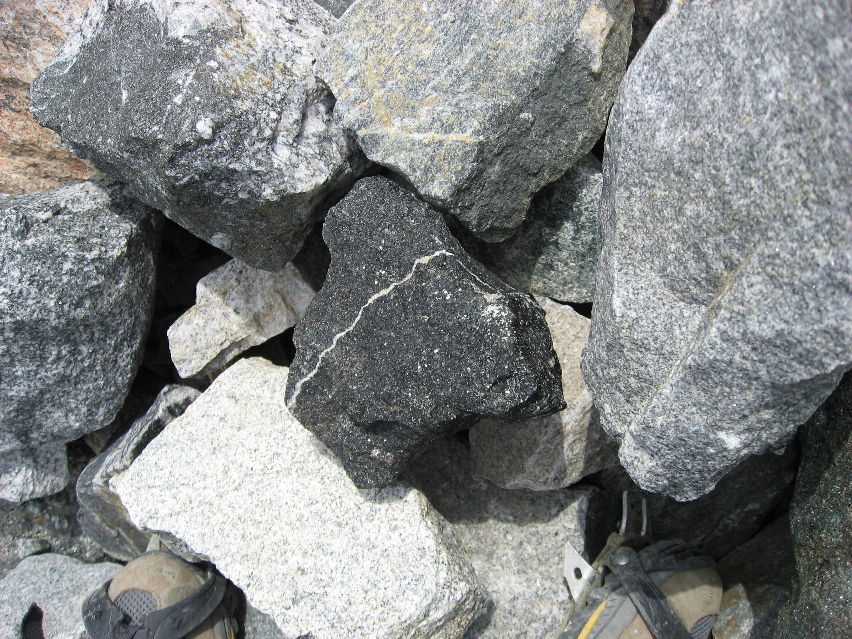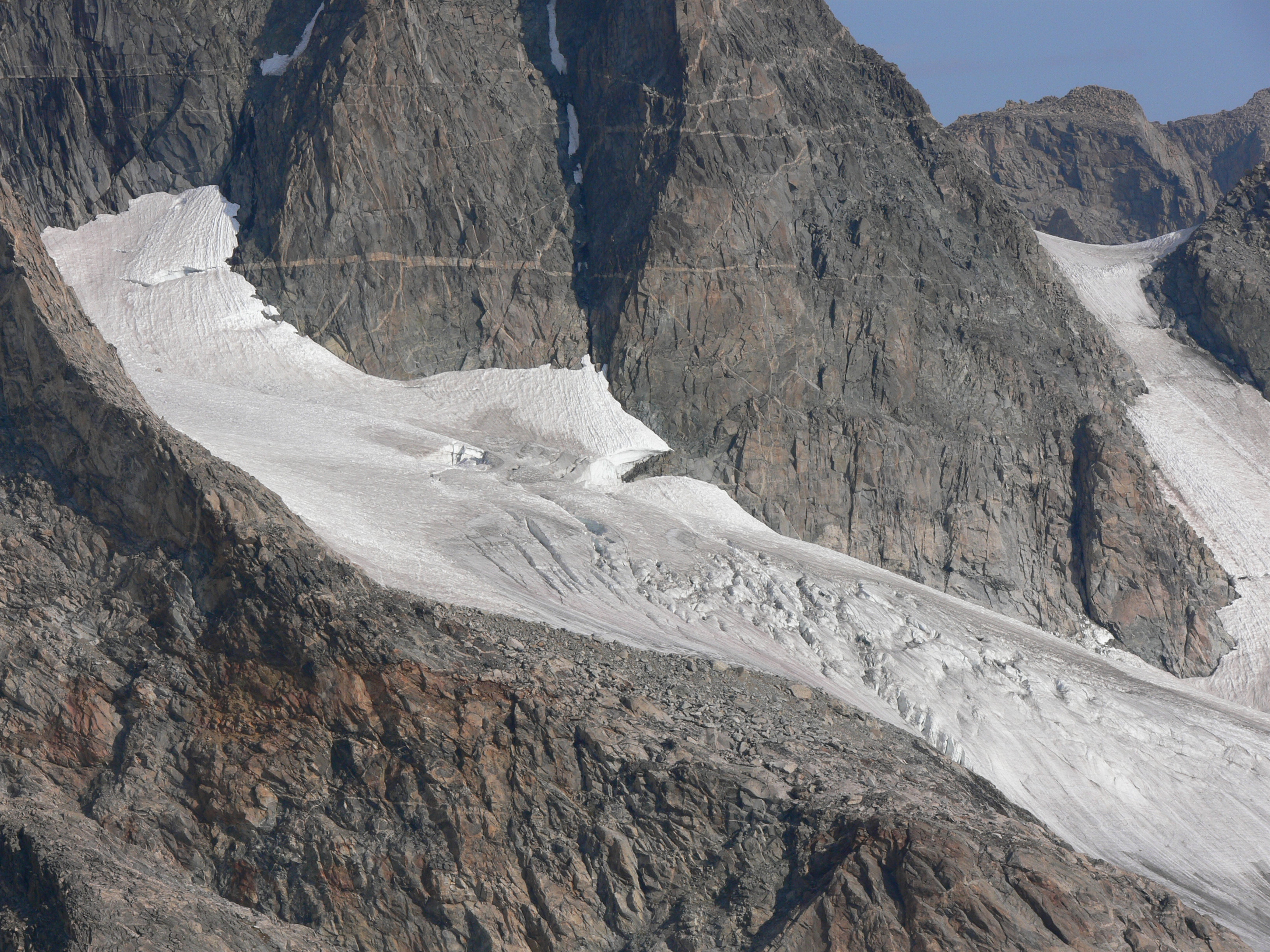 The boulders were on top of ice! In some places like this, they slide off. Every minute or so, a rock or two would come tumbling down the ice chute.
